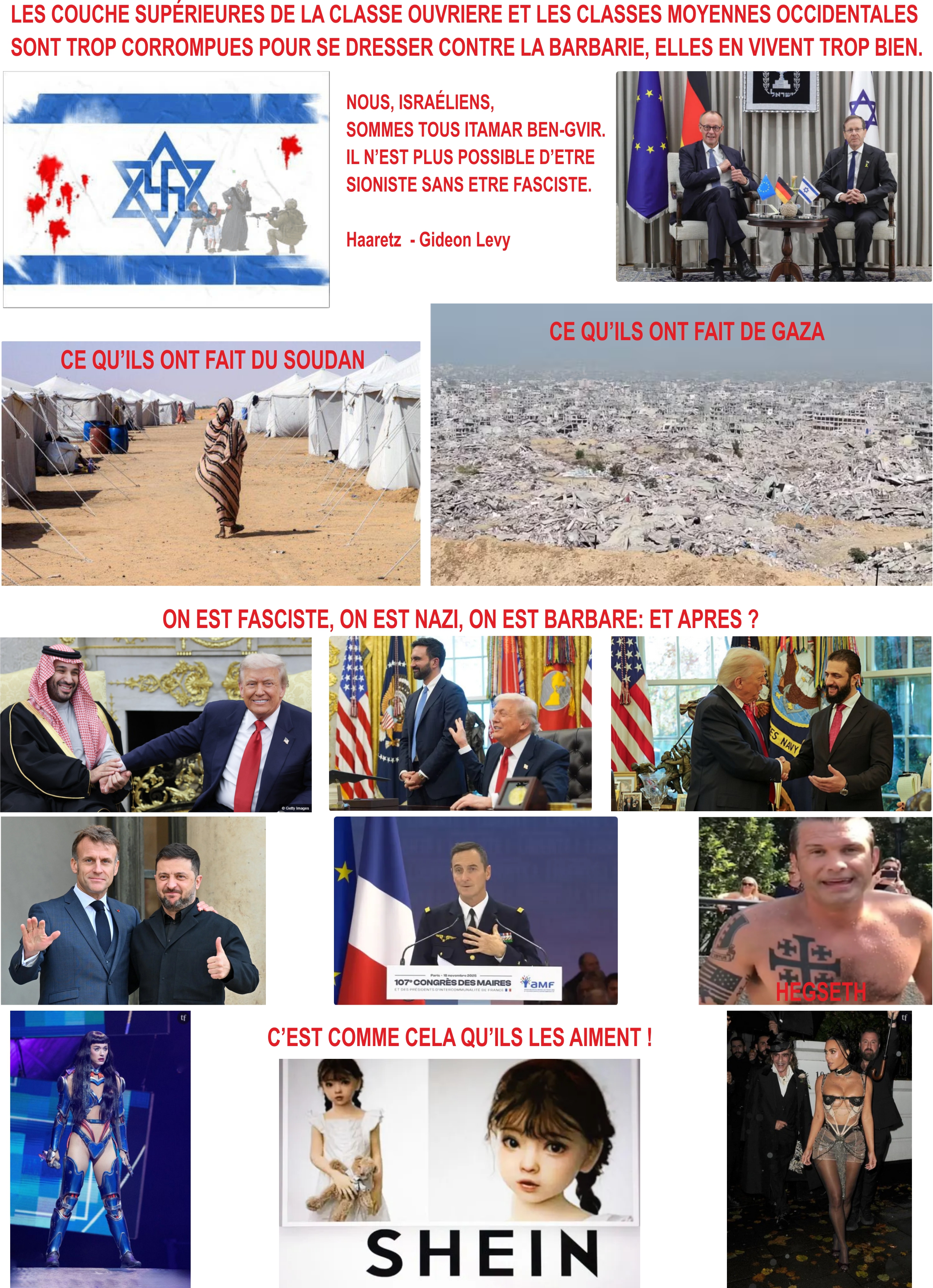 Le 23 novembre 2025 Je commence à récupérer. Et cela se voit ! A chaud. Comme d'habitude on se moque de nous. On va bien se marrer en lisant les commentaires tordus des uns et des autres, qui seront révélateurs. Je ne vous ai pas dit tout ce que je pensais, car cela n'aurait à rien, j'aurais été incompris. Quelques réflexion sur le plan américain en 28 points visant à régler le conflit en Ukraine. Sur le volet économique. 12. Un important paquet mondial de mesures pour reconstruire l’Ukraine J-C - Mais aucun pour reconstruire les territoires que l'Ukraine a dévastés et qui seront intégrés à la Fédération de Russie. Ce sont les travailleurs Russes qui paieront ! 13. La Russie sera réintégrée dans l’économie mondiale, avec des discussions prévues sur la levée des sanctions, la réintégration du G8 et la conclusion d’un accord de coopération économique à long terme avec les Etats-Unis. J-C - Dans le cadre de l'accord scellé entre les Américains et les Russe dans le dos ou sur le dos des Européens principalement. La " coopération économique à long terme avec les Etats-Unis", le fin mot de l'histoire qu'on connaissait depuis le début, mais je m'étais abstenu de le dire. Ils se font la guerre, ils font la paix et puis ils passent aux choses sérieuses : le business ! 14. Quelque 100 milliards de dollars d’actifs russes gelés seront investis dans les projets menés par les Etats-Unis pour reconstruire l’Ukraine et y investir, les Etats-Unis recevant 50 % des bénéfices de l’initiative. L’Europe ajoutera 100 milliards de dollars afin d’augmenter le montant des investissements disponibles pour la reconstruction de l’Ukraine. Les fonds européens gelés seront débloqués, et le reste des fonds russes gelés sera investi dans un véhicule d’investissement américano-russe séparé. J-C - La confirmation de la confiscation d’actifs russes au profit des Américains. Les Russes sont décidément riches et généreux, qu'en pensent les travailleurs russes ? Une analyse plus générale. Les Américains avaient dit : Si on se sert de l'Ukraine pour mettre la pression militairement sur la Russie, celle-ci sera obligée de réagir militairement, et c'est ce qui s'est passé. On peut donc en déduire que les Américains avaient manigancé cette guerre sans attaquer directement la Russie. Pourquoi ? Parce que les Américains en avaient besoin, ils sont davantage alliés qu'ennemis dans ce conflit. Ils en avaient besoin sur quel plan ? Pardi, économique ! Comment cela ? Pour tirer parti de cette guerre au détriment de ses vassaux de l'Union européenne, les dindons de la farce qui endosseront le coût de cette guerre ou le reporteront sur ses peuples dont les conditions matérielles et sociales se dégraderont, notamment. Par ailleurs, il y a quelque temps déjà les Russes avaient indiqué aux Américains qu'une fois la guerre terminée, ils pourraient profiter des richesses extraites des territoires conquis, allant même jusqu'à imaginer que des entreprises russes et américaines pourraient s'associer pour exploiter ces richesses et se les partager, tandis que les Européens seraient exclus de ce deal ou ils ne récolteraient que des miettes, nous y sommes. Bien que les peuples occidentaux bénéficient d'un niveau de vie supérieur à celui des autres peuples dans le monde, ils représentent un marché en grande partie saturé ou limité, en perte de vitesse par rapport aux marchés en expansion en Asie, en Amérique du Sud et en Afrique. Pour ne donner qu'un exemple, la classe moyenne chinoise devrait doubler au cours des dix années à venir pour atteindre 800 000 de consommateurs potentiel, soit plus du double de celle de toute l'Europe. Les revenus ou le niveau de vie des masses augmente considérablement sur les continents précédemment mentionnés, beaucoup plus vite qu'en Europe ou il stagne ou tend à régresser. Il s'écoule aujourd'hui plus de marchandises partout dans le monde qu'en Europe, et cette tendance va s'amplifier dans l'avenir en fonction du développement économique d'autres pays ou régions du monde. Mais surtout, l'Europe possède peu de matières premières et d'énergies fossiles, elle s'est énormément désindustrialisée au cours des 50 dernières années, les gains qu'elle tira de son développement industriel au cours des XIXe et XXe siècle s'épuisent rapidement, désormais son économie repose essentiellement sur le secteur tertiaire des services... Sa population est vieillissante, et sa main d'oeuvre dans le cadre de la division internationale du travail ne représente plus qu'une fraction de la masse salariale mondiale, la plus coûteuse ou la moins concurrentielle, ce qui la condamne sur le marché mondial face à la progression de nouvelles puissances mondiales, Chine, Inde, Russie, Brésil, et plein d'autres pays qui jouent sur le plan régional un rôle économique avec lesquels l'UE ne peut pas rivaliser. Le renchérissement de l'euro et la politique coloniale de ses dirigeants conduits de nombreux pays à se détourner de l'euro (et du dollar) pour régler leurs transactions commerciales, cette tendance devrait aussi se renforcer dans l'avenir. Bref, l'UE est inévitablement condamnée à la stagnation ou à la régression économique, d'où son exclusion du règlement de la guerre en Ukraine proposé par les Américains et les Russes. A suivre. Sur le volet politique. 26. Toutes les parties impliquées dans ce conflit bénéficieront d’une amnistie totale pour leurs actions pendant la guerre et s’engageront à ne faire aucune réclamation ni n’envisager aucune plainte à l’avenir. J-C - Vous aurez noté qu'il n'est plus question de "dénazification" de l'Ukraine, puisque les nazis et leurs commanditaires, leurs porte-parole politiques, tous les complices de leurs massacres ou actes de barbarie bénéficieront d’une "amnistie totale". Autrement dit, c'était un faux prétexte avancé par 
