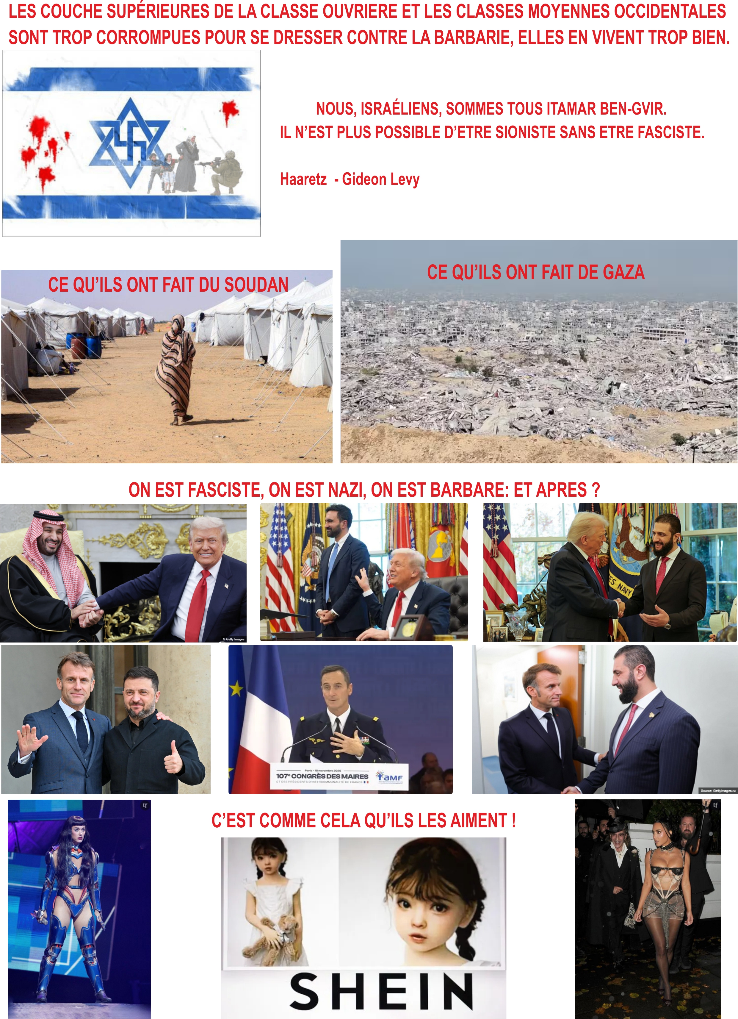 Le 23 novembre 2025 Je commence à récupérer. Et cela se voit ! A chaud. Comme d'habitude on se moque de nous. On va bien se marrer en lisant les commentaires tordus des uns et des autres, qui seront révélateurs. Je ne vous ai pas dit tout ce que je pensais, car cela n'aurait à rien, j'aurais été incompris. Quelques réflexion sur le plan américain en 28 points visant à régler le conflit en Ukraine. Sur le volet économique. 12. Un important paquet mondial de mesures pour reconstruire l’Ukraine J-C - Mais aucun pour reconstruire les territoires que l'Ukraine a dévastés et qui seront intégrés à la Fédération de Russie. Ce sont les travailleurs Russes qui paieront ! 13. La Russie sera réintégrée dans l’économie mondiale, avec des discussions prévues sur la levée des sanctions, la réintégration du G8 et la conclusion d’un accord de coopération économique à long terme avec les Etats-Unis. J-C - Dans le cadre de l'accord scellé entre les Américains et les Russe dans le dos ou sur le dos des Européens principalement. La " coopération économique à long terme avec les Etats-Unis", le fin mot de l'histoire qu'on connaissait depuis le début, mais je m'étais abstenu de le dire. Ils se font la guerre, ils font la paix et puis ils passent aux choses sérieuses : le business ! 14. Quelque 100 milliards de dollars d’actifs russes gelés seront investis dans les projets menés par les Etats-Unis pour reconstruire l’Ukraine et y investir, les Etats-Unis recevant 50 % des bénéfices de l’initiative. L’Europe ajoutera 100 milliards de dollars afin d’augmenter le montant des investissements disponibles pour la reconstruction de l’Ukraine. Les fonds européens gelés seront débloqués, et le reste des fonds russes gelés sera investi dans un véhicule d’investissement américano-russe séparé. J-C - La confirmation de la confiscation d’actifs russes au profit des Américains. Les Russes sont décidément riches et généreux, qu'en pensent les travailleurs russes ? Une analyse plus générale. Les Américains avaient dit : Si on se sert de l'Ukraine pour mettre la pression militairement sur la Russie, celle-ci sera obligée de réagir militairement, et c'est ce qui s'est passé. On peut donc en déduire que les Américains avaient manigancé cette guerre sans attaquer directement la Russie. Pourquoi ? Parce que les Américains en avaient besoin, ils sont davantage alliés qu'ennemis dans ce conflit. Ils en avaient besoin sur quel plan ? Pardi, économique ! Comment cela ? Pour tirer parti de cette guerre au détriment de ses vassaux de l'Union européenne, les dindons de la farce qui endosseront le coût de cette guerre ou le reporteront sur ses peuples dont les conditions matérielles et sociales se dégraderont, notamment. Par ailleurs, il y a quelque temps déjà les Russes avaient indiqué aux Américains qu'une fois la guerre terminée, ils pourraient profiter des richesses extraites des territoires conquis, allant même jusqu'à imaginer que des entreprises russes et américaines pourraient s'associer pour exploiter ces richesses et se les partager, tandis que les Européens seraient exclus de ce deal ou ils ne récolteraient que des miettes, nous y sommes. Bien que les peuples occidentaux bénéficient d'un niveau de vie supérieur à celui des autres peuples dans le monde, ils représentent un marché en grande partie saturé ou limité, en perte de vitesse par rapport aux marchés en expansion en Asie, en Amérique du Sud et en Afrique. Pour ne donner qu'un exemple, la classe moyenne chinoise devrait doubler au cours des dix années à venir pour atteindre 800 000 de consommateurs potentiel, soit plus du double de celle de toute l'Europe. Les revenus ou le niveau de vie des masses augmente considérablement sur les continents précédemment mentionnés, beaucoup plus vite qu'en Europe ou il stagne ou tend à régresser. Il s'écoule aujourd'hui plus de marchandises partout dans le monde qu'en Europe, et cette tendance va s'amplifier dans l'avenir en fonction du développement économique d'autres pays ou régions du monde. Mais surtout, l'Europe possède peu de matières premières et d'énergies fossiles, elle s'est énormément désindustrialisée au cours des 50 dernières années, les gains qu'elle tira de son développement industriel au cours des XIXe et XXe siècle s'épuisent rapidement, désormais son économie repose essentiellement sur le secteur tertiaire des services... Sa population est vieillissante, et sa main d'oeuvre dans le cadre de la division internationale du travail ne représente plus qu'une fraction de la masse salariale mondiale, la plus coûteuse ou la moins concurrentielle, ce qui la condamne sur le marché mondial face à la progression de nouvelles puissances mondiales, Chine, Inde, Russie, Brésil, et plein d'autres pays qui jouent sur le plan régional un rôle économique avec lesquels l'UE ne peut pas rivaliser. Le renchérissement de l'euro et la politique coloniale de ses dirigeants conduits de nombreux pays à se détourner de l'euro (et du dollar) pour régler leurs transactions commerciales, cette tendance devrait aussi se renforcer dans l'avenir. Bref, l'UE est inévitablement condamnée à la stagnation ou à la régression économique, d'où son exclusion du règlement de la guerre en Ukraine proposé par les Américains et les Russes. A suivre. Sur le volet politique. 26. Toutes les parties impliquées dans ce conflit bénéficieront d’une amnistie totale pour leurs actions pendant la guerre et s’engageront à ne faire aucune réclamation ni n’envisager aucune plainte à l’avenir. J-C - Vous aurez noté qu'il n'est plus question de "dénazification" de l'Ukraine, puisque les nazis et leurs commanditaires, leurs porte-parole politiques, tous les complices de leurs massacres ou actes de barbarie bénéficieront d’une "amnistie totale". Autrement dit, c'était un faux prétexte avancé par 